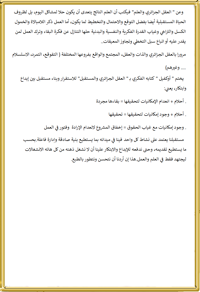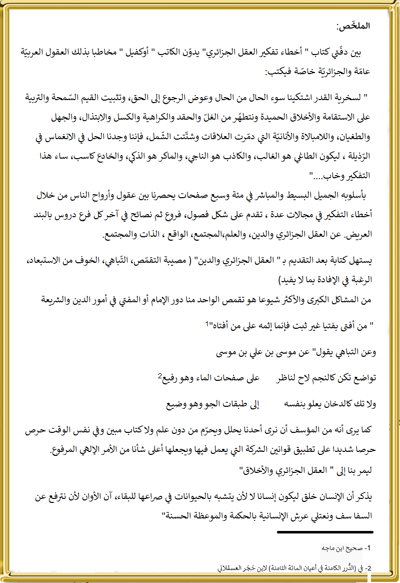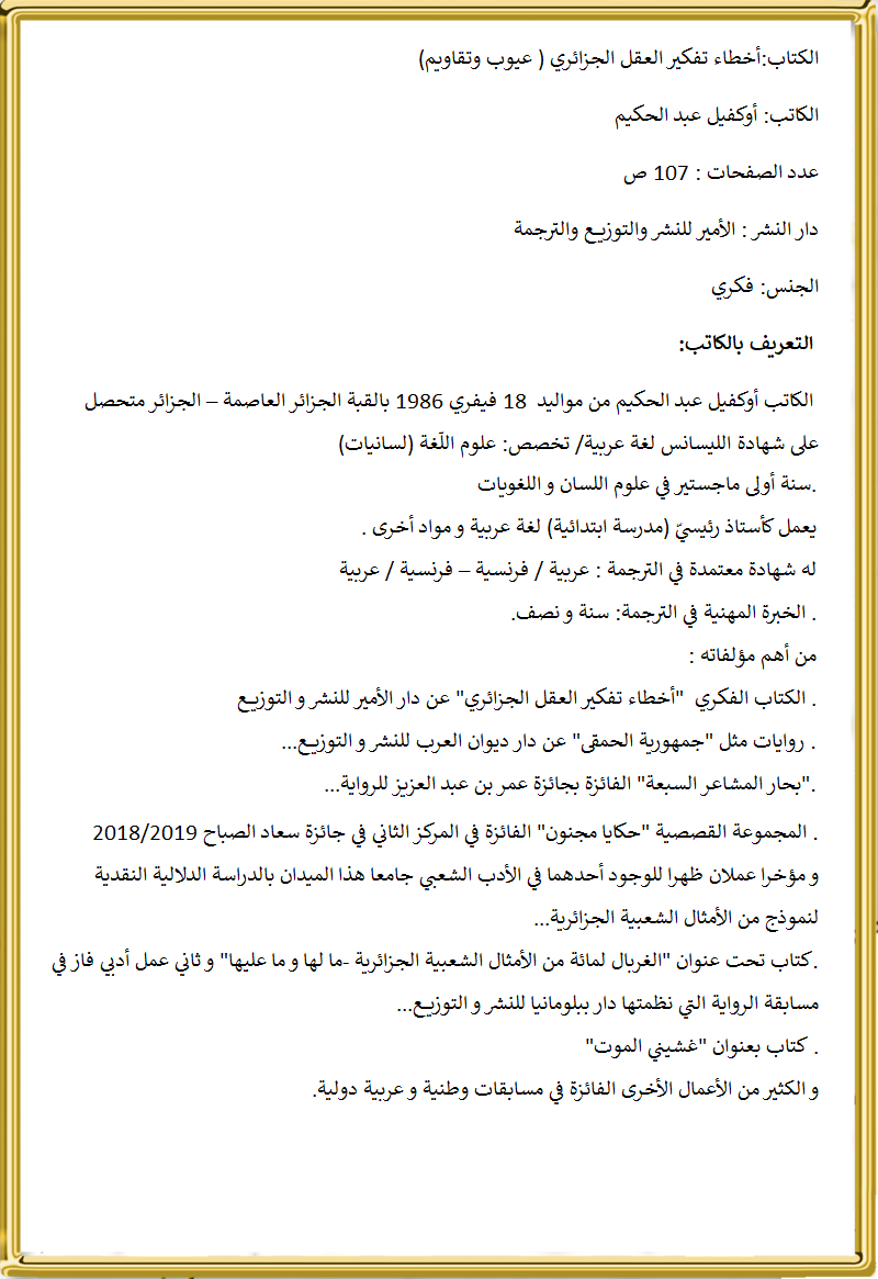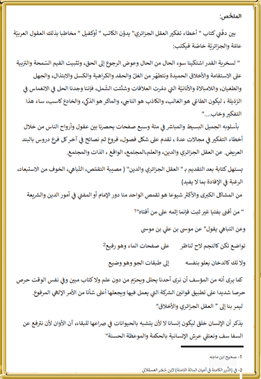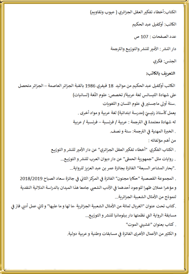 قراءة لـــــــــكتاب أخطاء تفكير العقل الجزائري ( عيوب وتقاويم)